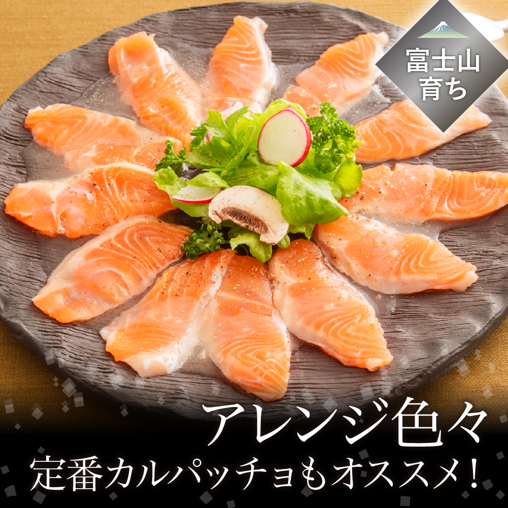 豊かな自然の中で、清らかな水と愛情をたっぷり受けて育った富士山サーモン。臭みが少なく、身の締まりと脂のりのバランスが絶妙です。生食ならではの、とろけるような食感と濃厚な旨味をご堪能ください。
