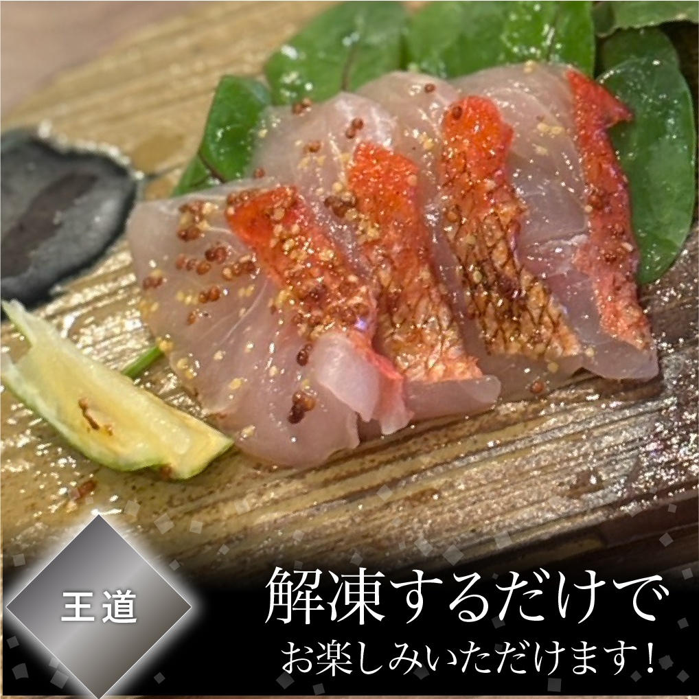 深海で育まれた高級魚、金目鯛を炙りでお楽しみいただけます。香ばしく炙った金目鯛の美味しさをそのまま閉じ込めた極冷スライスです。